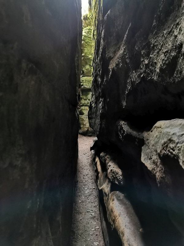 Trotz des wechselhaften Wetters schlüpfen wir in die Wanderschuhe und freuen uns über fast menschenleere Wege, Sandsteinschluchten und schmale Durchlässe. Einer davon, der sogenannte Kuelscheier, zu deutsch Kohlenscheune, da hier früher Holzkohle gelagert wurde, weist eine Breite von maximal 50 cm auf und die Felswände schließen sich hoch über unseren Köpfen zu einem Tunnel. Dies ist nichts für korpulente Wanderer und Klaustrophobiker und angesichts der Dunkelheit sind wir froh, eine Stirnlampe dabeizuhaben.