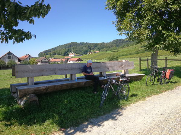 Nach dem Werkstattbesuch sind wir leider immer noch nicht schlauer. Wieder mag das Lesegerät das Auto nicht oder auch umgekehrt. So zeigt sich zwar immer noch das Problem, aber eine Lösung liegt fern. Immerhin streikt er noch nicht völlig und fährt uns immer noch ein paar Kilometer in die Stadtrandlage. Wir suchen uns einen Parkplatz im Dörfchen Pfyn und buchsieren die Räder auf die Straße. Bis zum Bodensee nach Steckborn sind es zwar nur etwa 13 Kilometer, aber die haben es in sich, denn ein Höhenzug liegt dazwischen, den es zu überqueren gilt. Am Mittag haben wir es geschafft und pausieren am Ufer, während wir überlegen, wie der Rückweg zu bewältigen sein wird. Wir wählen den Weg um den Höhenzug herum und sparen uns so die ganz steilen Aufstiege. Die letzte Rast gönnen wir uns an einem Platz mit schöner Aussicht auf das Tal der Thur und hätten es bis Islikon nicht mehr weit, doch das Auto steht ja in Pfyn. Über Feldwege, kleine Wanderwege und schließlich auf einem Damm finden wir zurück und haben nun abzüglich der Pausen fast acht Stunden auf den Sätteln verbracht.