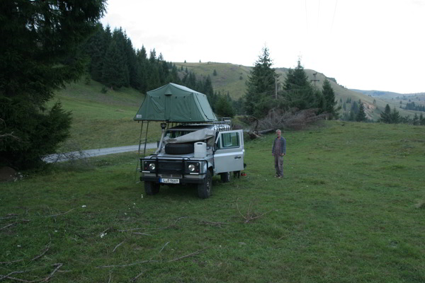 Bei unseren Wirtsleuten trinken wir noch einen Kaffee, bevor wir uns weiter auf den Weg machen, immer östlich entlang der Bistrita. Da wir die großen Straßen eher meiden, finden wir uns bald auf immer schlechter werdenden Pisten durch abgeschiedene Dörfer, in denen die Zeit, abgesehen von einigen Autos, stehengeblieben scheint. Die Suche nach einem Platz für die Nacht gestaltet sich schwierig, denn fast alle Forststraßen, die von der Piste wegführen, dürfen offiziell nicht befahren werden. Es hat geregnet und bald fahren wir nur noch durch Schlamm und Pfützen, vorbei an staunenden Holzfällern, bis wir endlich im Hellen noch eine Wiese finden, ein wenig abseits der letzten Hirten, auf der wir unser Nachtlager aufschlagen können. Es fängt an zu regnen, also verbringen wir den Rest des Abends im Auto und nutzen eine kleine Regenpause zum Zeltaufbau. Juri döst friedlich auf der Rückbank, nur ab und zu stößt er im Traum ein leises „wuff“ aus.