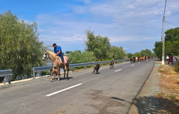 Wir nehmen noch ein Bad und anschließend Kurs auf das Donaudelta. Unser lustiges Navi findet Feldwege, die sogar eine Straßennummer haben und erzählt uns mitten im Nichts, dass wir „jetzt abbiegen“ sollen auf einen Weg, den es nicht gibt. Da hat der Bauer einfach darübergepflügt. Sicher fahren sonst hier auch nur Pferdewagen. Große Bewässerungsgräben, die trocken und voller Müll liegen, begleiten unseren Weg. An einer wilden Müllkippe müssen wir noch vorbei, dann sind wir wieder auf einer Asphaltstraße. Tulcea ist trotz seiner langen Geschichte auf den ersten Blick nicht wirklich interessant, wir füllen nur die Reserven auf, bevor wir das Festland verlassen. In Nufaru finden wir die Fähre, die uns ins Delta bringen soll. Auf Nachfrage, wann sie denn übersetzt, meint einer, „erst wenn drei Fahrzeuge hinüber wollen“. Ein dazukommender Fußgänger ist aber wichtig genug, so müssen wir nicht lange warten, setzen über und fahren auf einer Piste in Richtung Partizani. An den Feldrändern sehen wir die Reste der letztjährigen Anpflanzungen. Fröhlich stehen hier die Hanfpflanzen am Straßenrand. Zwei Schlangen kreuzen unseren Weg. Wir identifizieren sie als Ringelnattern, allerdings sind diese hier eher grau gemustert und haben keinen gelben Fleck, wie die bei uns heimischen.